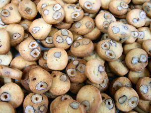 砂糖の少ないクッキー生地にやさしい味のヘーゼルナッツ(トルコ産)を。表情がそれぞれで人面のようです。2枚¥194 |